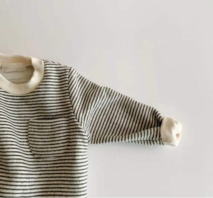 The jumpsuits feature a classic striped pattern, giving them a stylish and timeless look suitable for boys and girls alike. The easy-to-wear design includes snap buttons or a convenient zipper closure, making it simple for parents to dress and change their baby without hassle. The loose fit allows for freedom of movement, ensuring your baby stays cozy and happy as they explore the world around them.