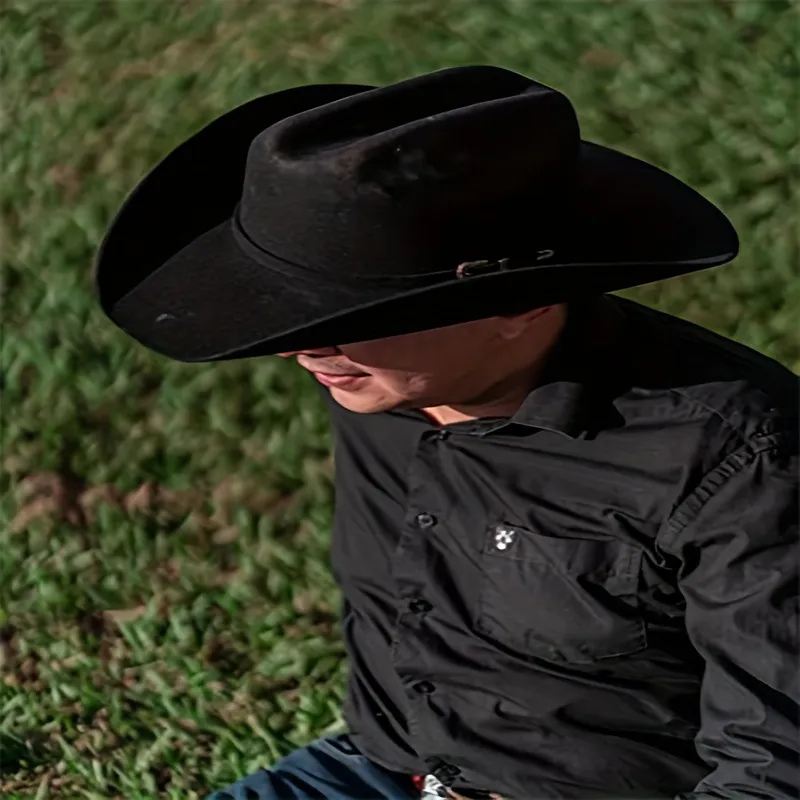 - Design: Classic cowboy silhouette with a dramatic wide brim.