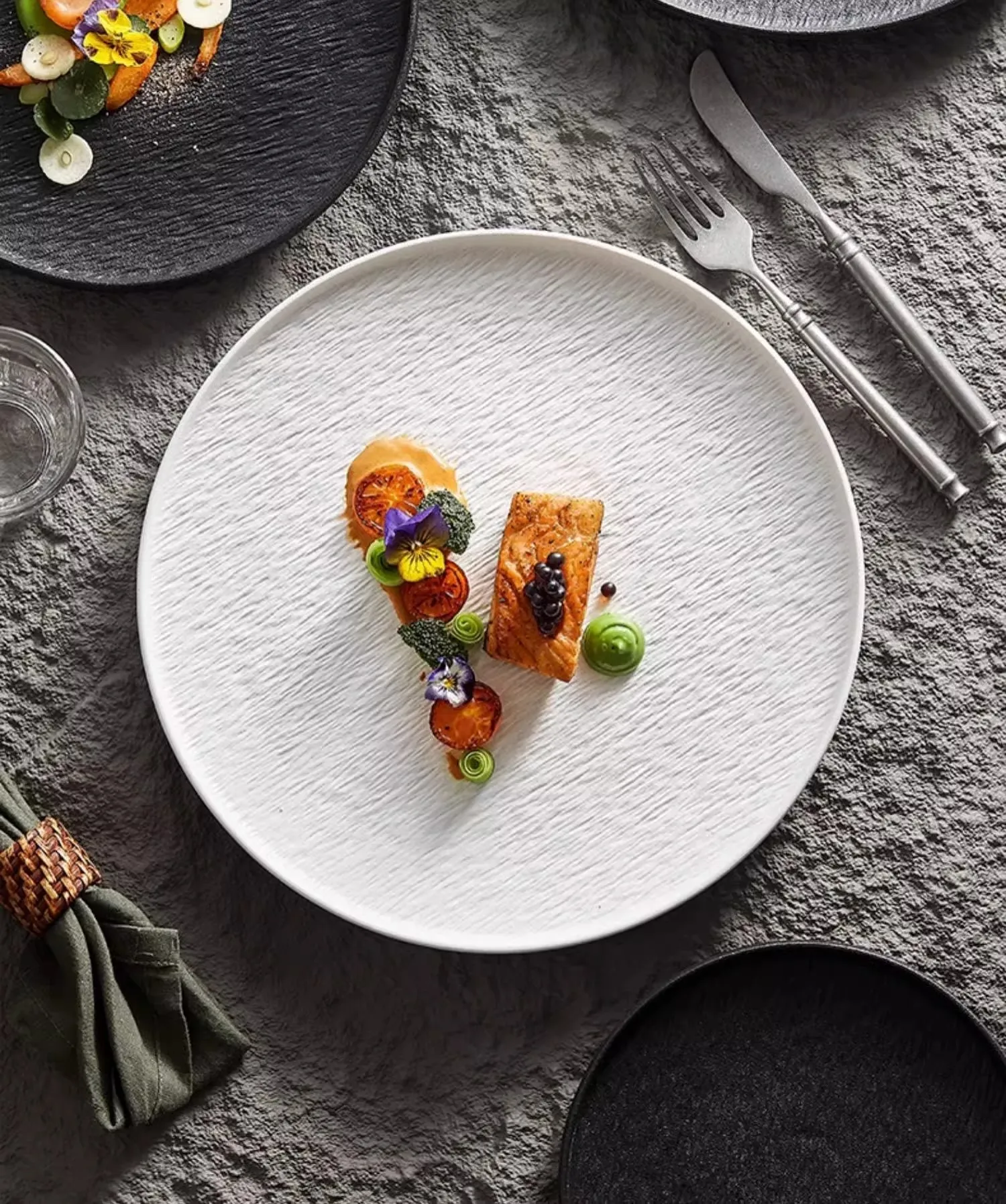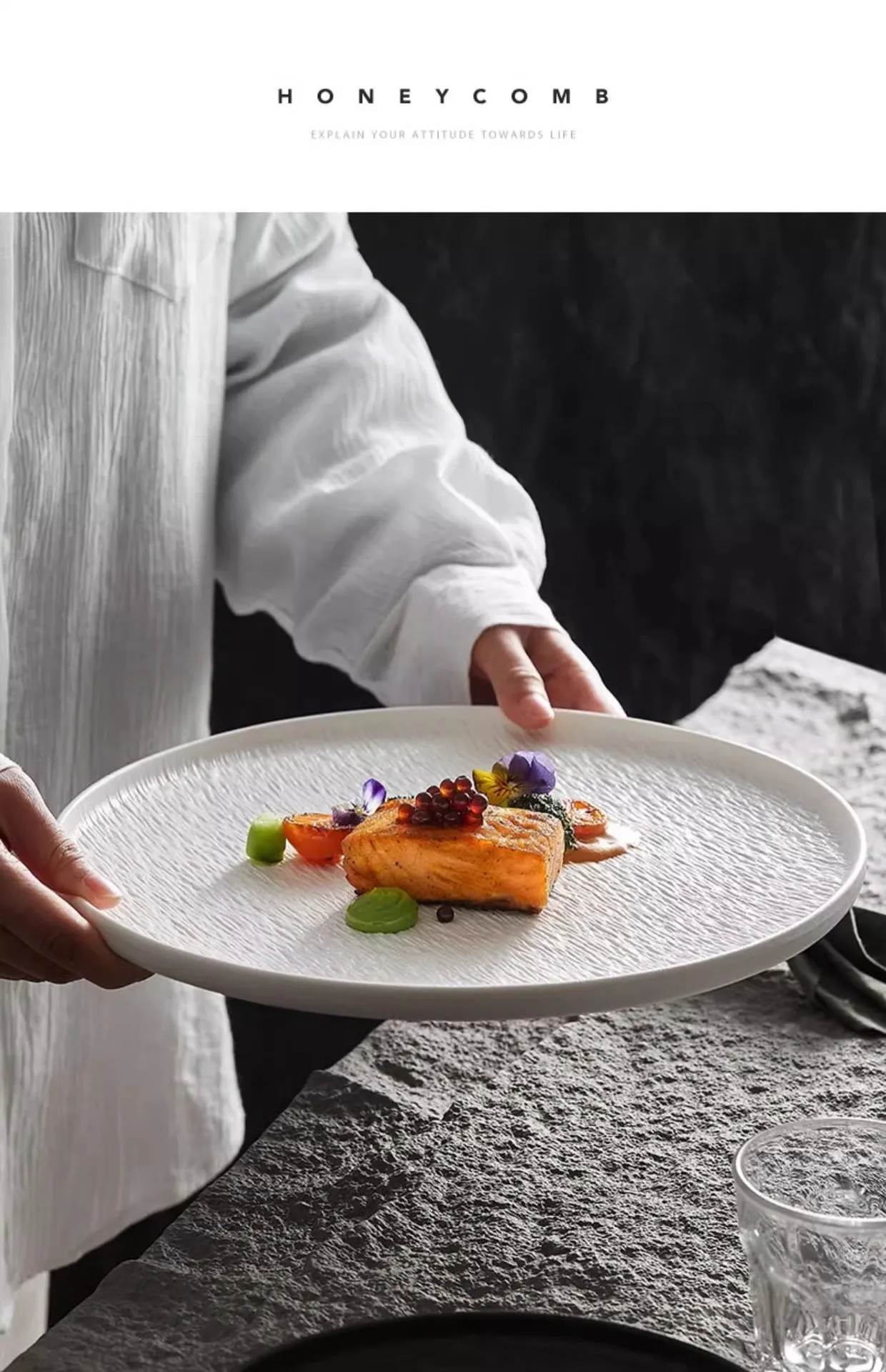 Its neutral white colour highlights the natural colours of food, making it ideal for steak, grilled meats, vegetables, and complete dinner portions. The ceramic material retains heat well, helping keep food warm for longer during meals. Whether used for family dinners, entertaining guests, or professional dining environments, this plate delivers both function and timeless style.