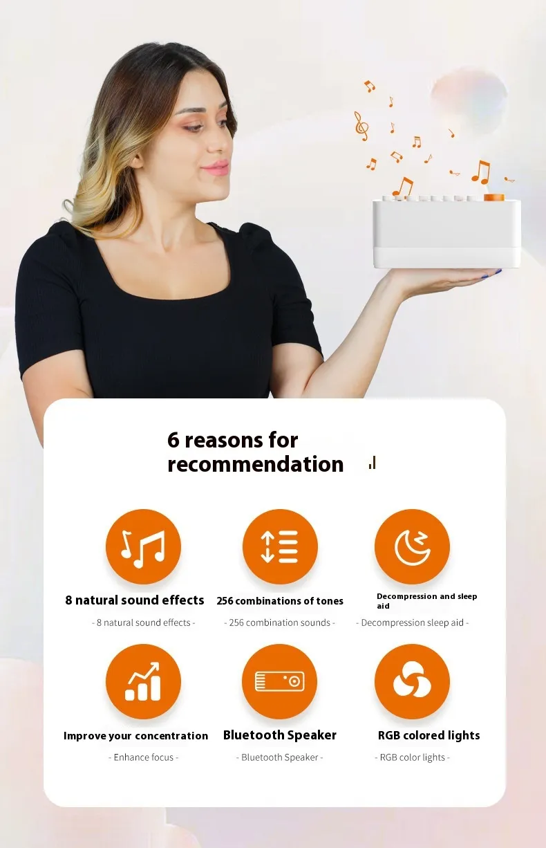 The White Noise Sleep Sound Machine stands out for its combination of soothing sounds, customizable lighting, and Bluetooth functionality. Designed to enhance your sleep environment, it provides the perfect balance of sound and light, promoting relaxation, reducing stress, and improving sleep quality. The RGB seven-color night light offers additional benefits, enhancing the visual atmosphere and adding a calming glow to any space.