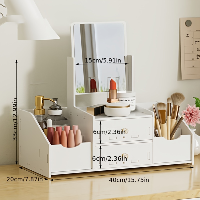 Spacious Storage: Includes two drawers and open compartments to store makeup, skincare products, and accessories.