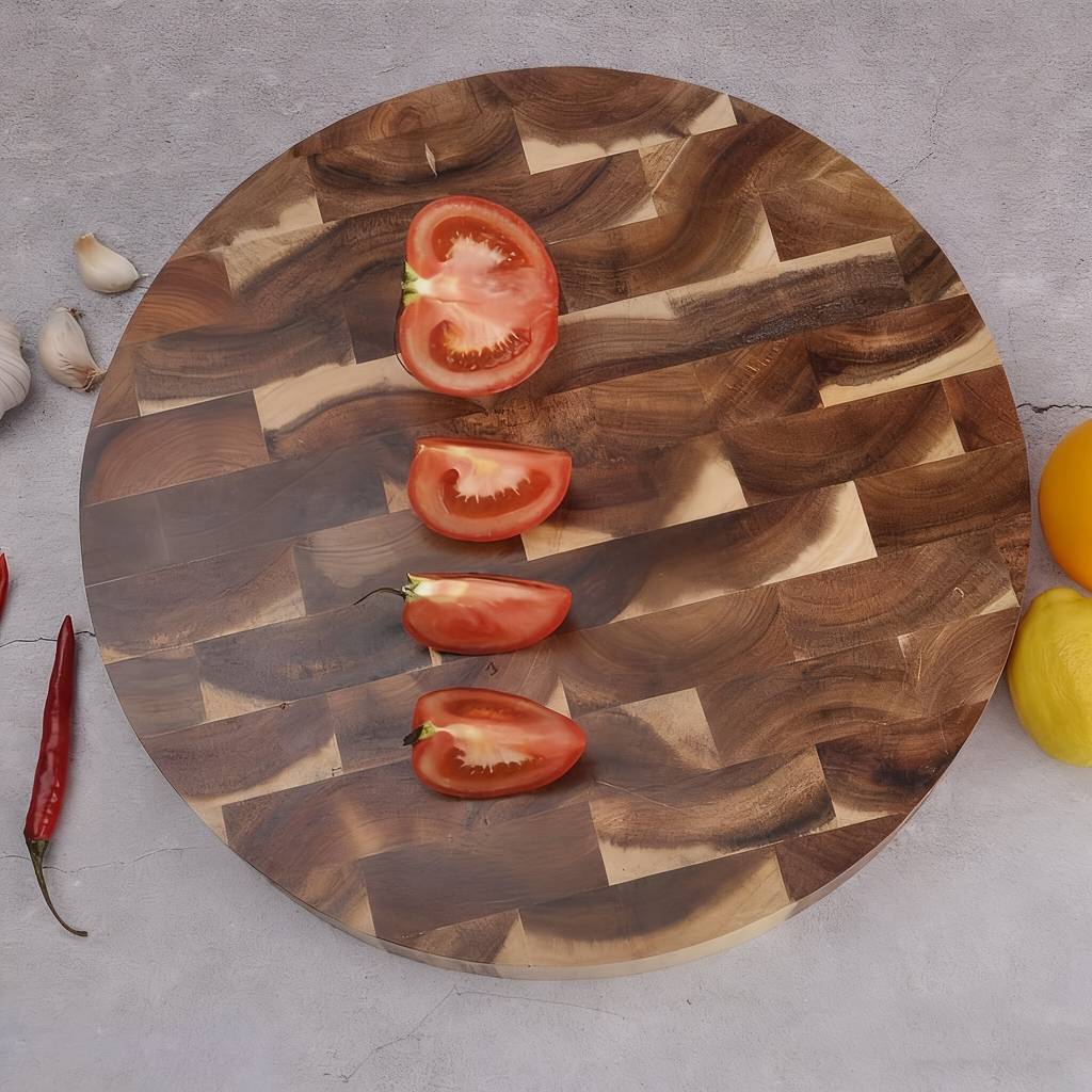 The Double-Sided Acacia Cutting Board (Brand: WIEZ) is crafted from high-quality acacia wood, known for its durability, moisture resistance, and beautiful natural grain. Each side is smooth and safe for direct food contact, and the round shape gives it a modern, decorative look that works well for chopping or serving.