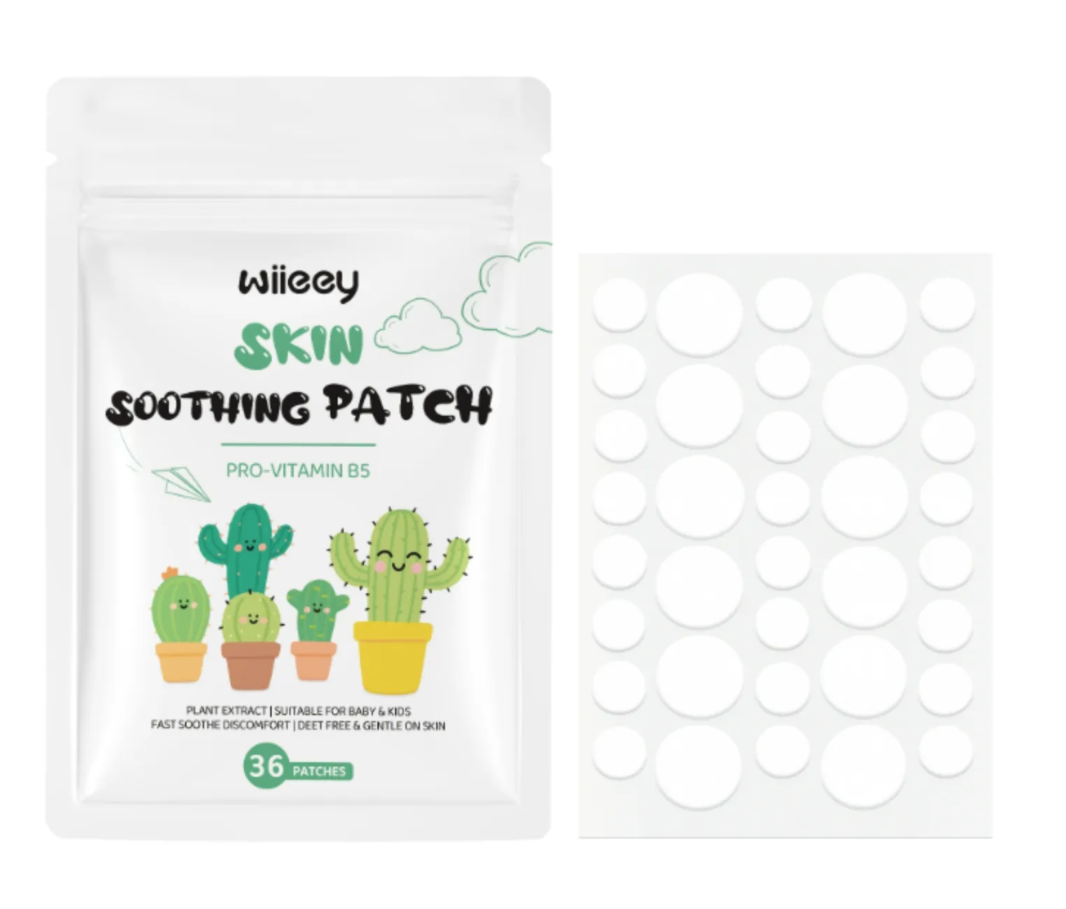 Wiieey Skin Soothing Patch with Pro-Vitamin B5 provides fast relief for skin discomfort. Gentle, DEET-free patches are ideal for babies, kids, and sensitive skin. 36 patches per pack.
