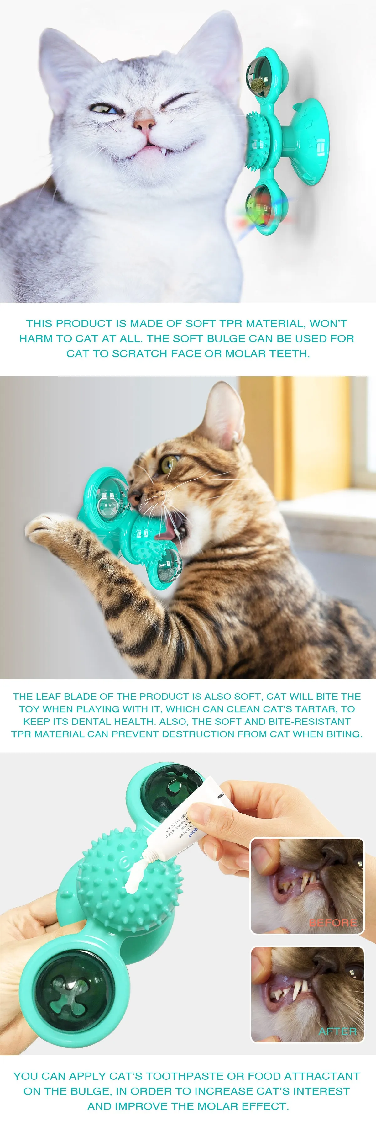 Stick It & Let It SPIN!Find a nice flat surface, stick the Fidget Spinner Windmill Cat Toy suction cup. It can be placed on a door, wall, tub, and floor. |