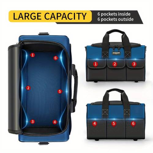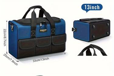 The wide mouth zipper allows for easy access to the contents of the bag, while the adjustable shoulder strap offers comfort and convenience during transport. Whether you're a mechanic, HVAC professional, or electrician, this tool bag is built to handle your tools and keep them organized for quick access during any job. The blue/black color combination gives it a sleek, professional appearance, making it ideal for work or gifting purposes.