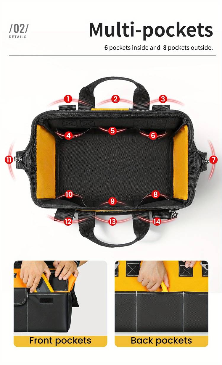 14-Pocket Design: This tool bag features 14 pockets for efficient organization, allowing you to store tools, fasteners, and