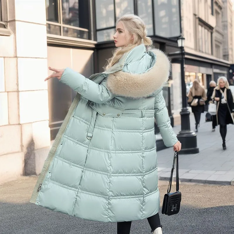 Winter Slim Long Jacket With Fur Hood And Belt Fashion Solid Hooded Coat Warm Clothing For Women