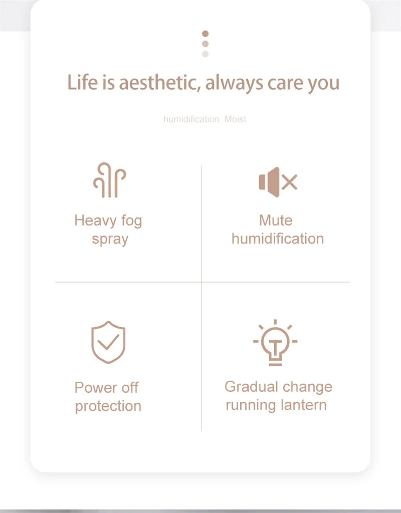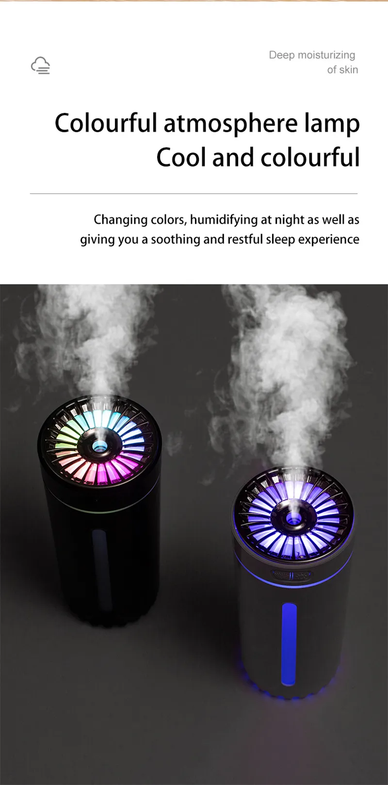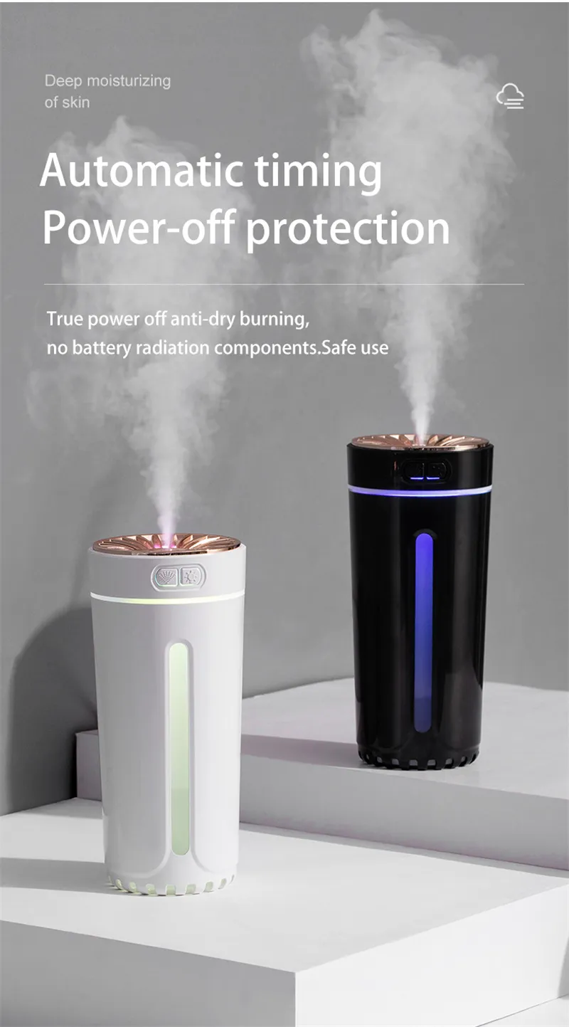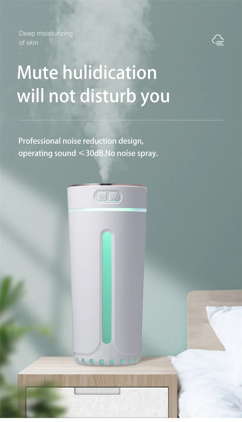 1.Built in 800mAlithium battery, which can work for 3-4 hours2. Colorful atmosphere lights, cool3. 20-35dB Low noise, does not affect sleep4. Moisturize at any time, not wet the desktop5. can be used in the car