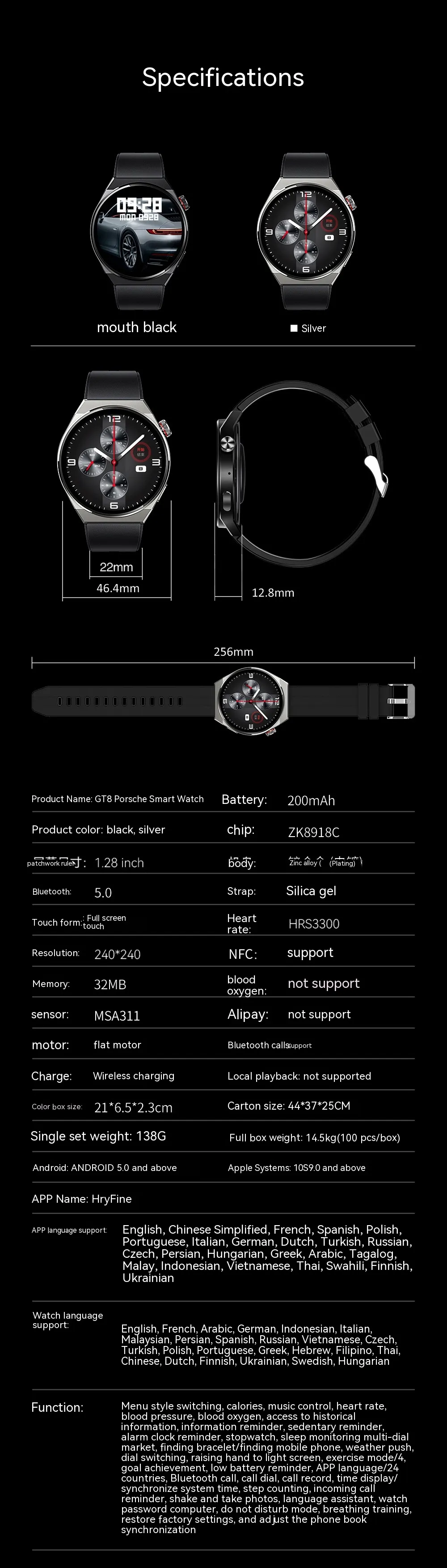 Function: Bluetooth calling, smart reminder, remote control selfie, sleep monitoring, blood oxygen detection