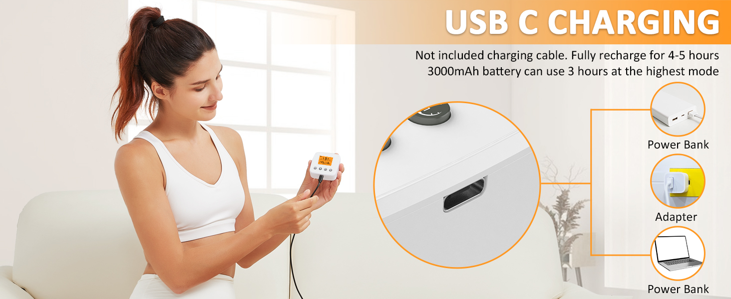 - Adjustable Timer with Automatic Shut-off Function: Wirelss ankle heating pad massager with 3 time settings (30, 45, 60 minutes),it is easy to set the ankle heating pad to run for the desired time, and the automatic shut-off function ensures safety.It uses a USB C charger and can be fully charged in just 4-5 hours. The 3000mAh battery can be used for 3 hours in the highest mode.