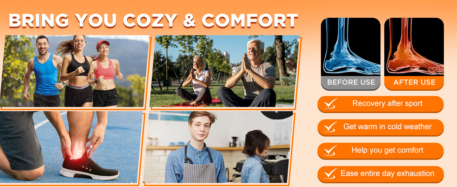 - Adjustable Size for Most: Unique contoured design makes it a great choice for the ankle area. The rechargeable ankle wrap is big enough to cater to most ankle shapes and sizes. Super soft material offers an elegant texture and a gentle touch, aiding in the even distribution of heat for maximum comfort. Specially designed ankle brace provides focused heat effect for foot, ankle