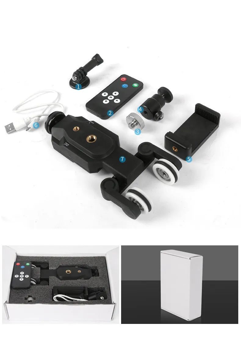 Product standard configuration: photography car, spherical pan/tilt, mobile phone holder, adapter + screw, USB charging cable