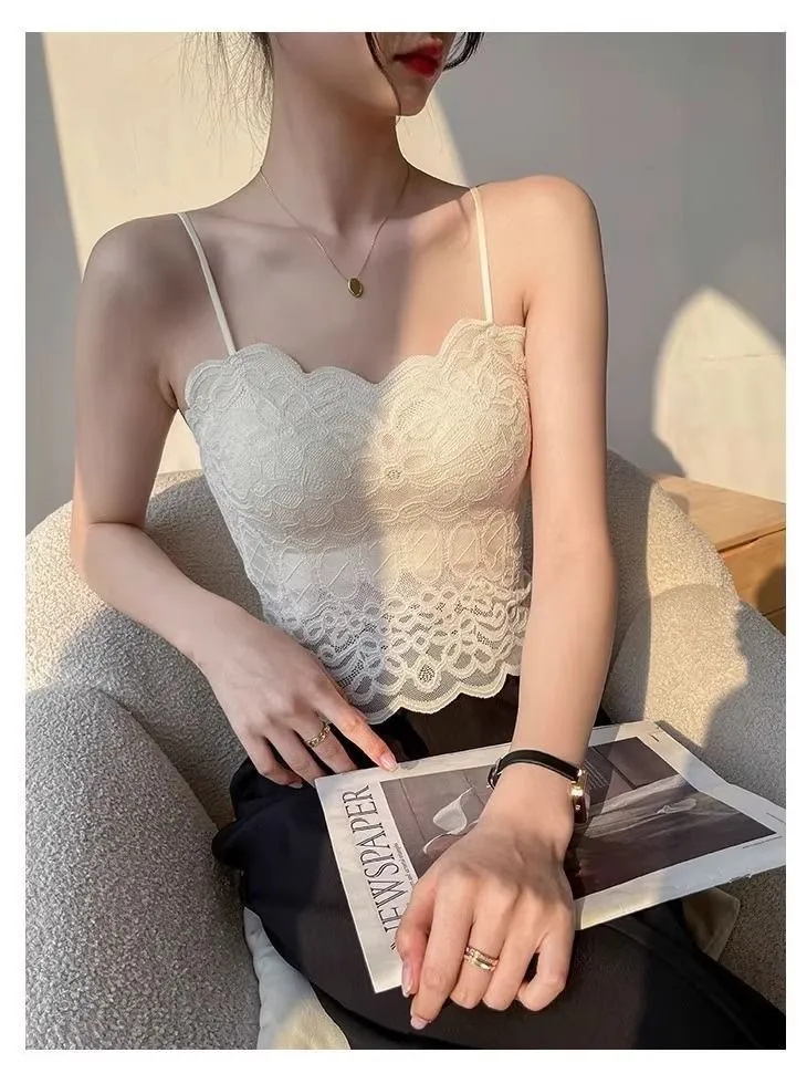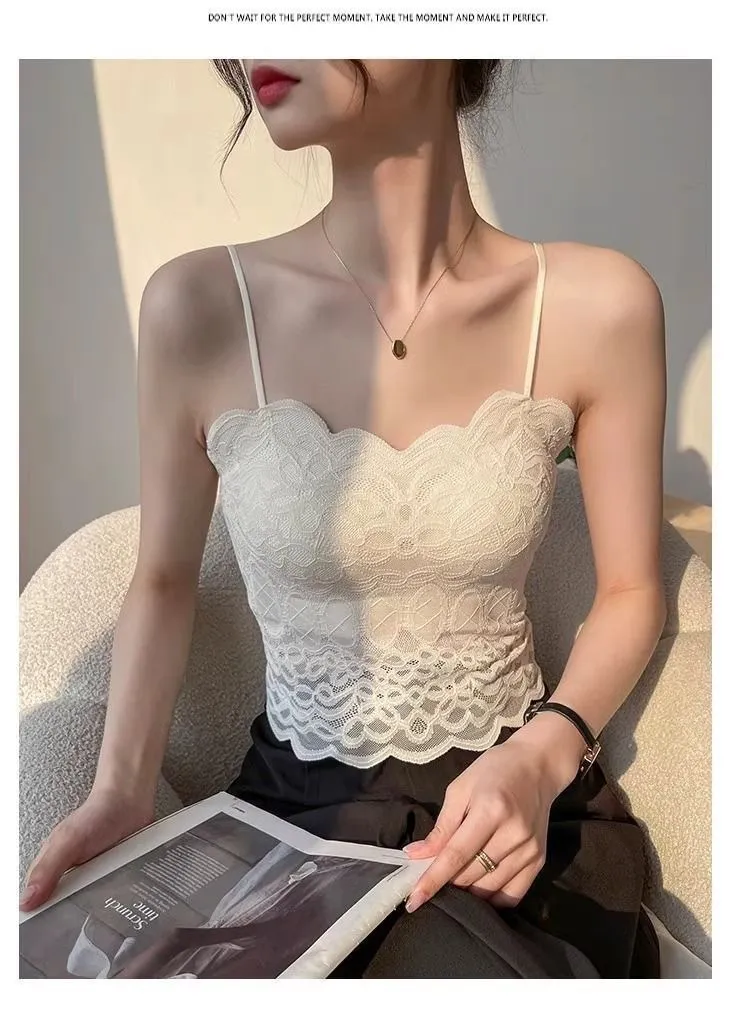 With Chest Pad Sexy Lace Beautiful Back Sling Spaghetti Strap Wavy Lace Vest: Chic, Elegant, and Bold