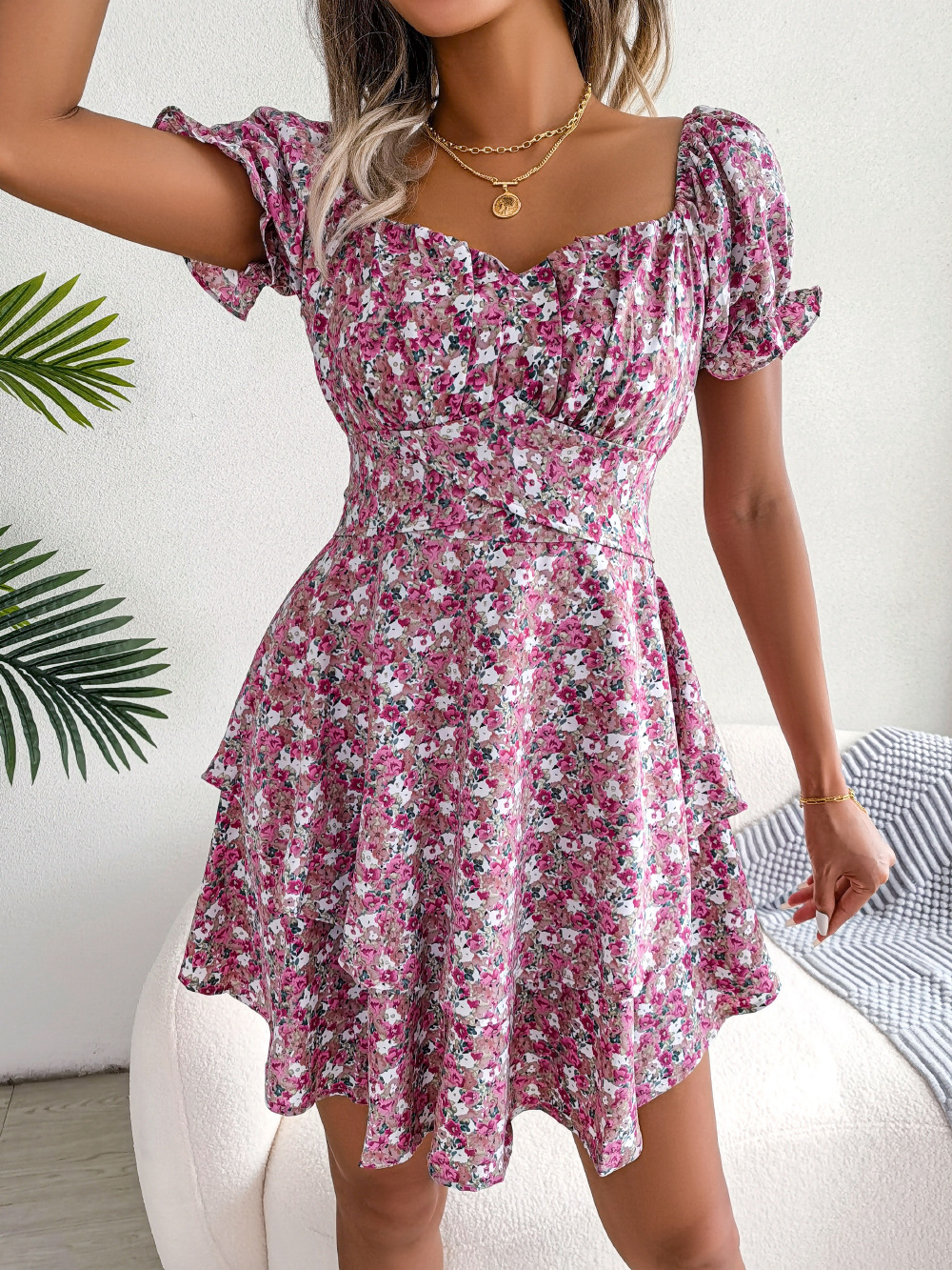 The dress features a vibrant floral print that adds a fresh and lively feel, perfect for summer. The short sleeves and high waist design emphasize a chic and feminine look, while the loose hem ensures comfort and freedom of movement. The shirring detail on the bust adds a subtle touch of texture, making this dress stand out.