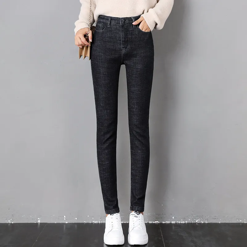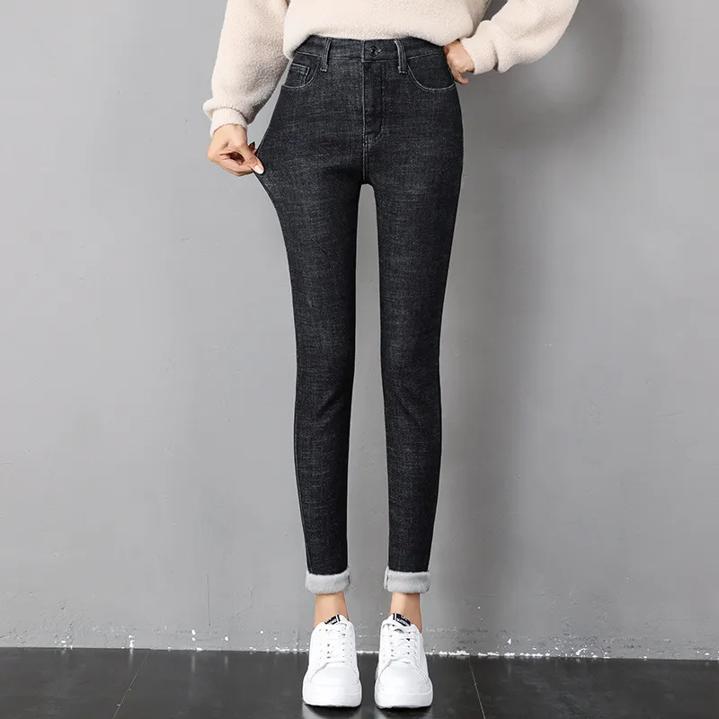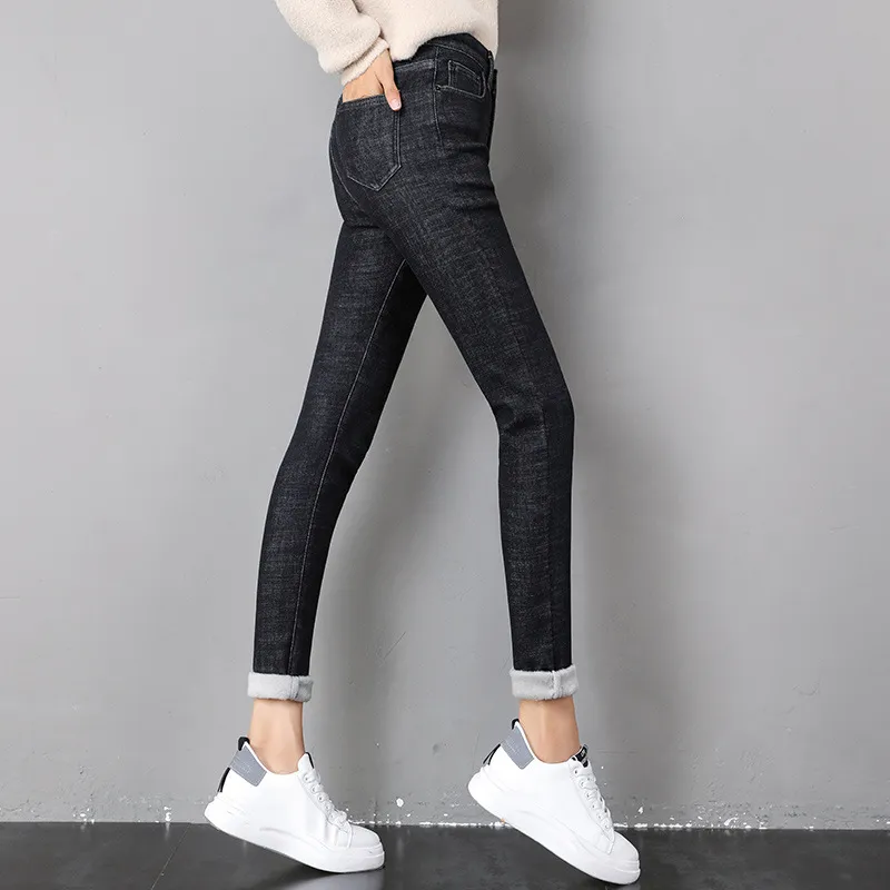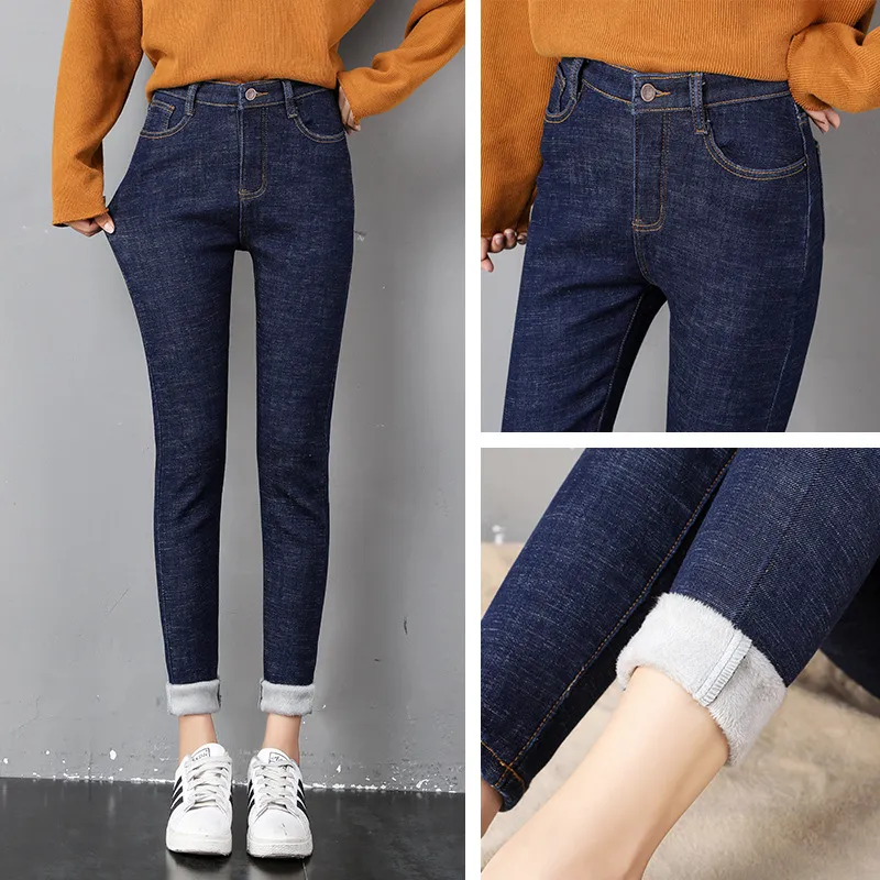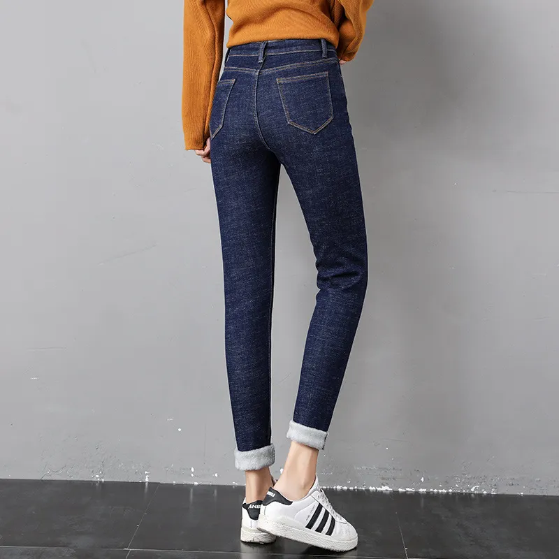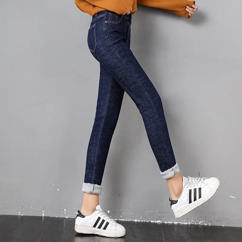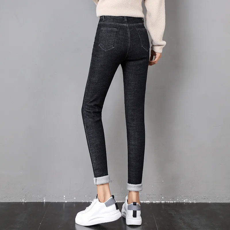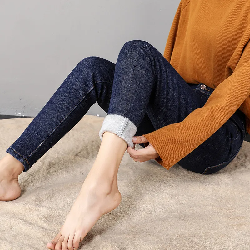 Women Thermal Jeans Winter Snow Warm Plush Stretch Jeans Lady Skinny Thicken Fleece Denim Long Pants Retro Blue Pencil Trousers