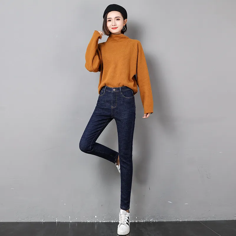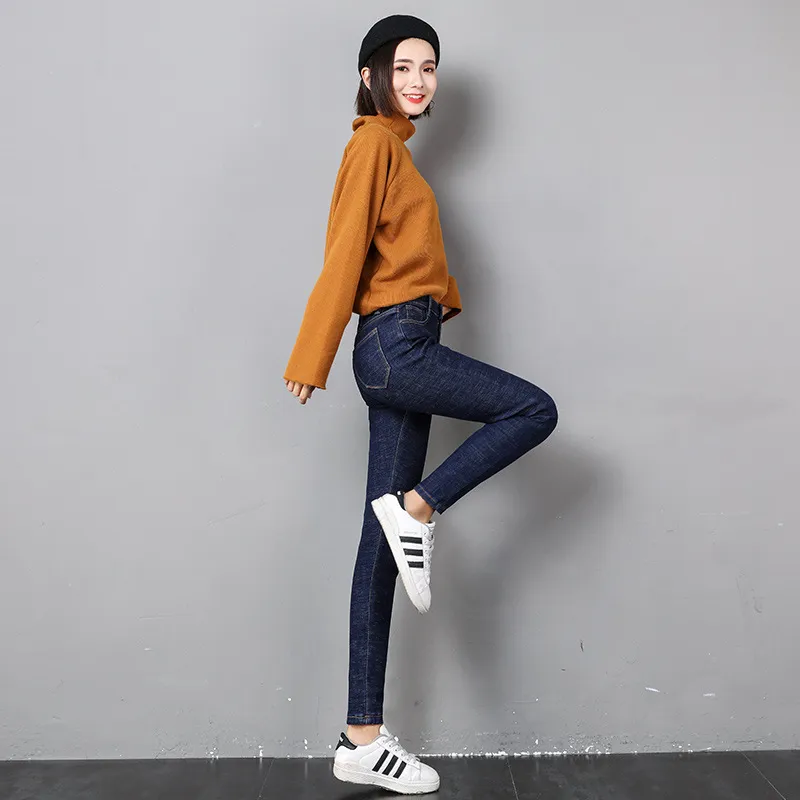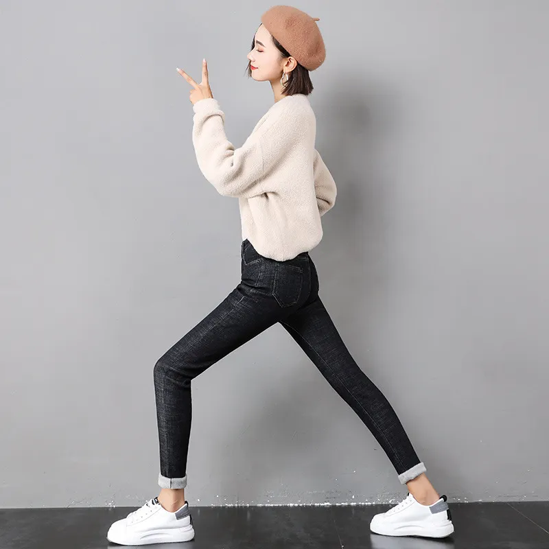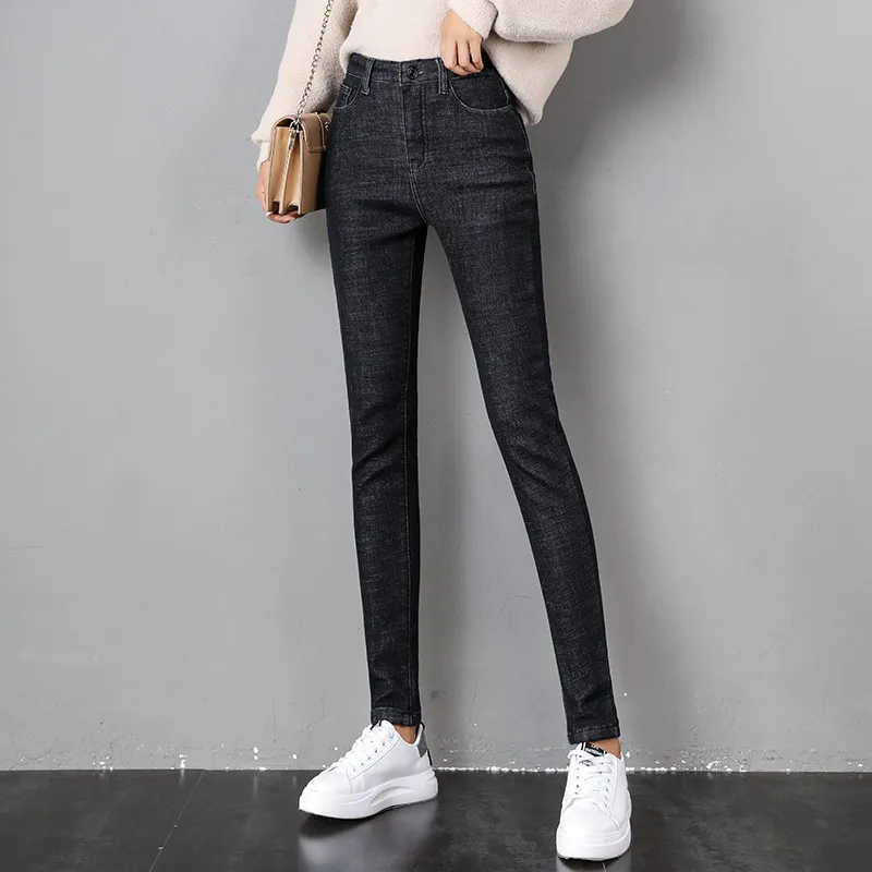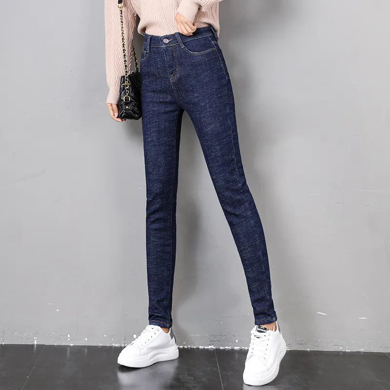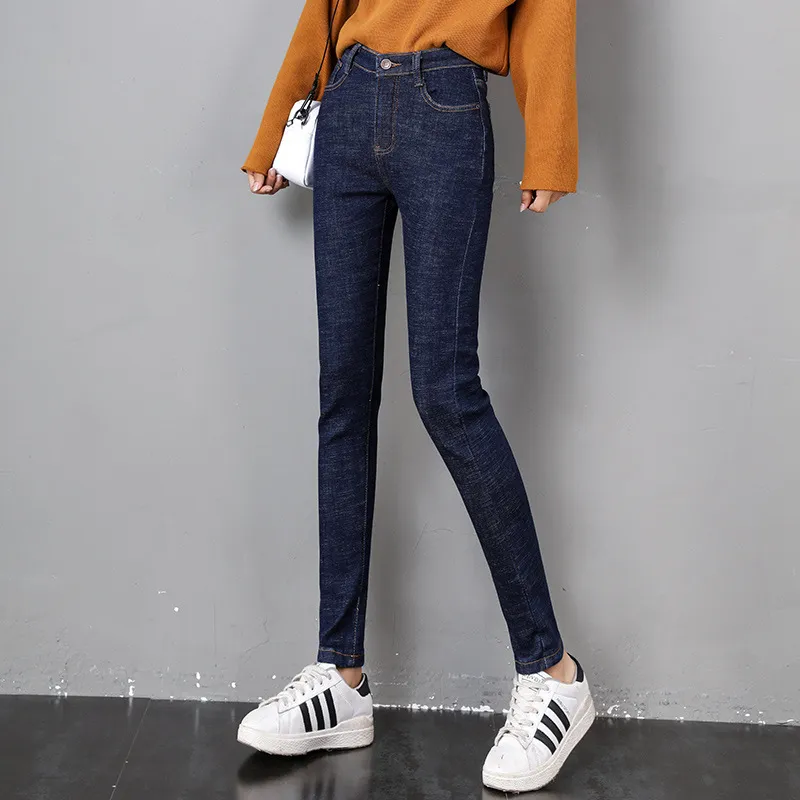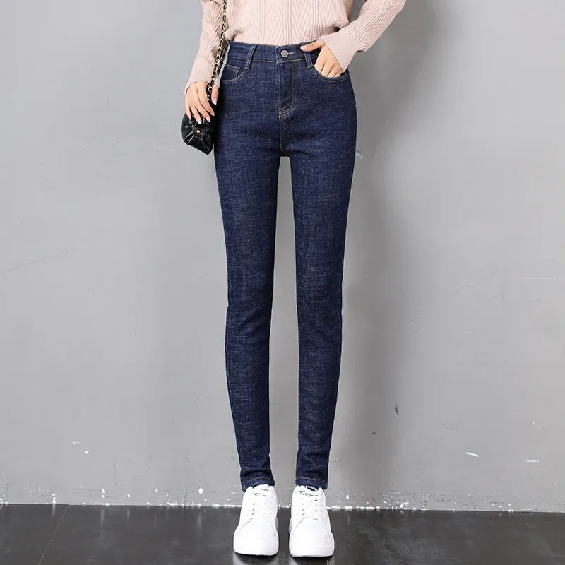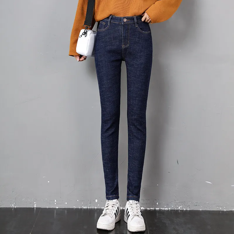 Women Thermal Jeans Winter Snow Warm Plush Stretch Jeans Lady Skinny Thicken Fleece Denim Long Pants Retro Blue Pencil Trousers