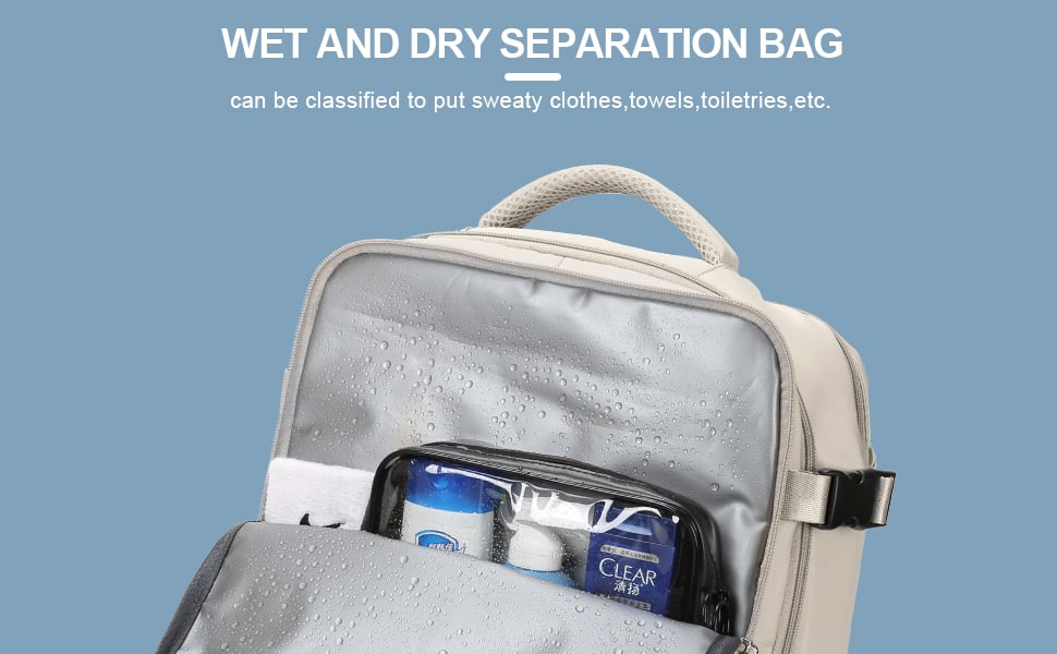 Separate compartment design for shoes and wet bag: 2 main pockets, 2 laptop compartments (suitable for 13-inch tablet and 14-inch laptop respectively), the wet bag is made of high-density waterproof material that can help you to separate dry items and wet items, if you have wet clothes or towel, you can put them in the wet bag. A separate shoe compartment can help you carry and keep your best shoes in your travel bag.