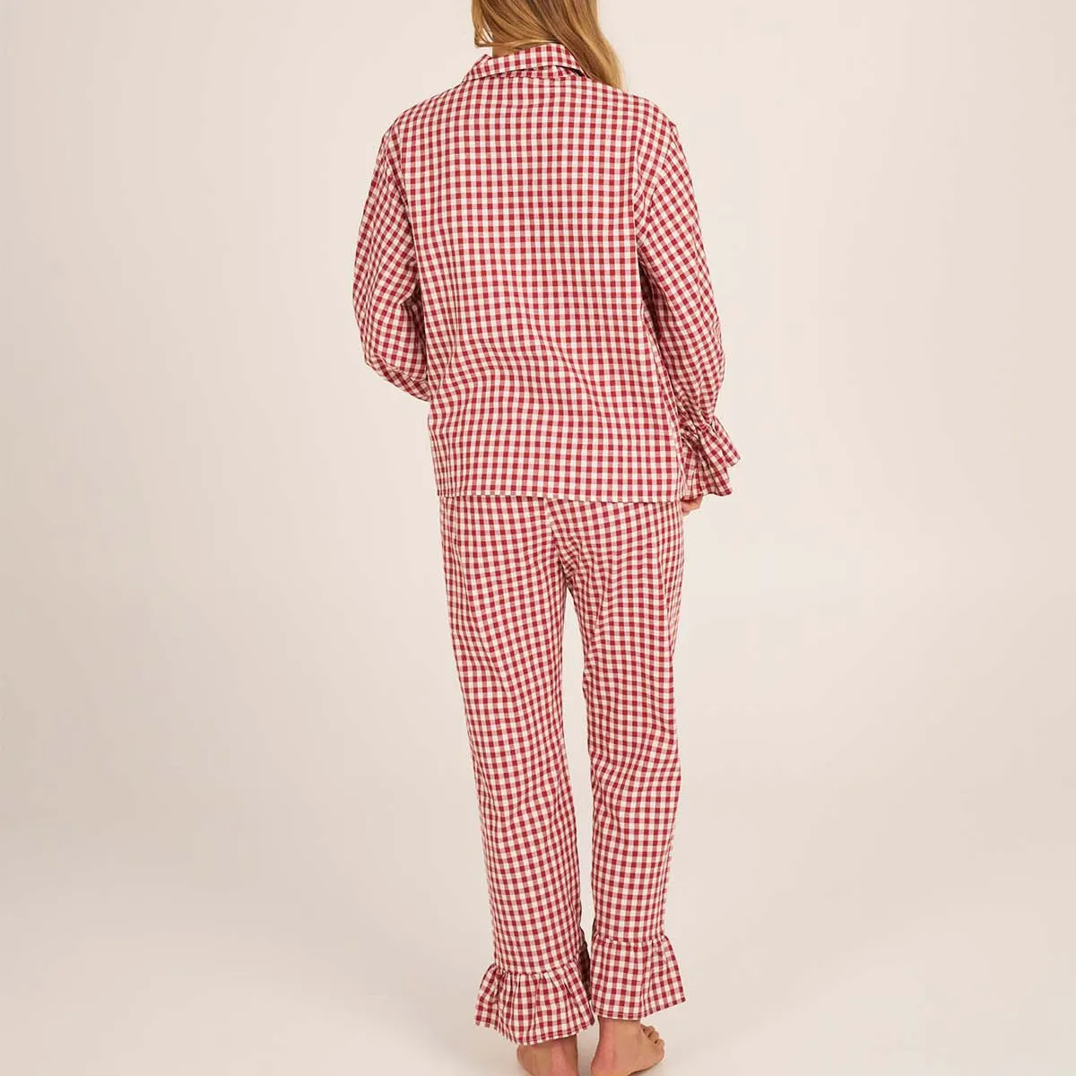- Feature: Plaid pattern, gingham lounge outfits, Y2k plaid pajama set, puff peplum shirt ruffle pants lounge set, tie front puff sleeve babydoll top, matching with ruffle hem wide leg pants, cute ruffle trim pj set, gingham pants pjs.