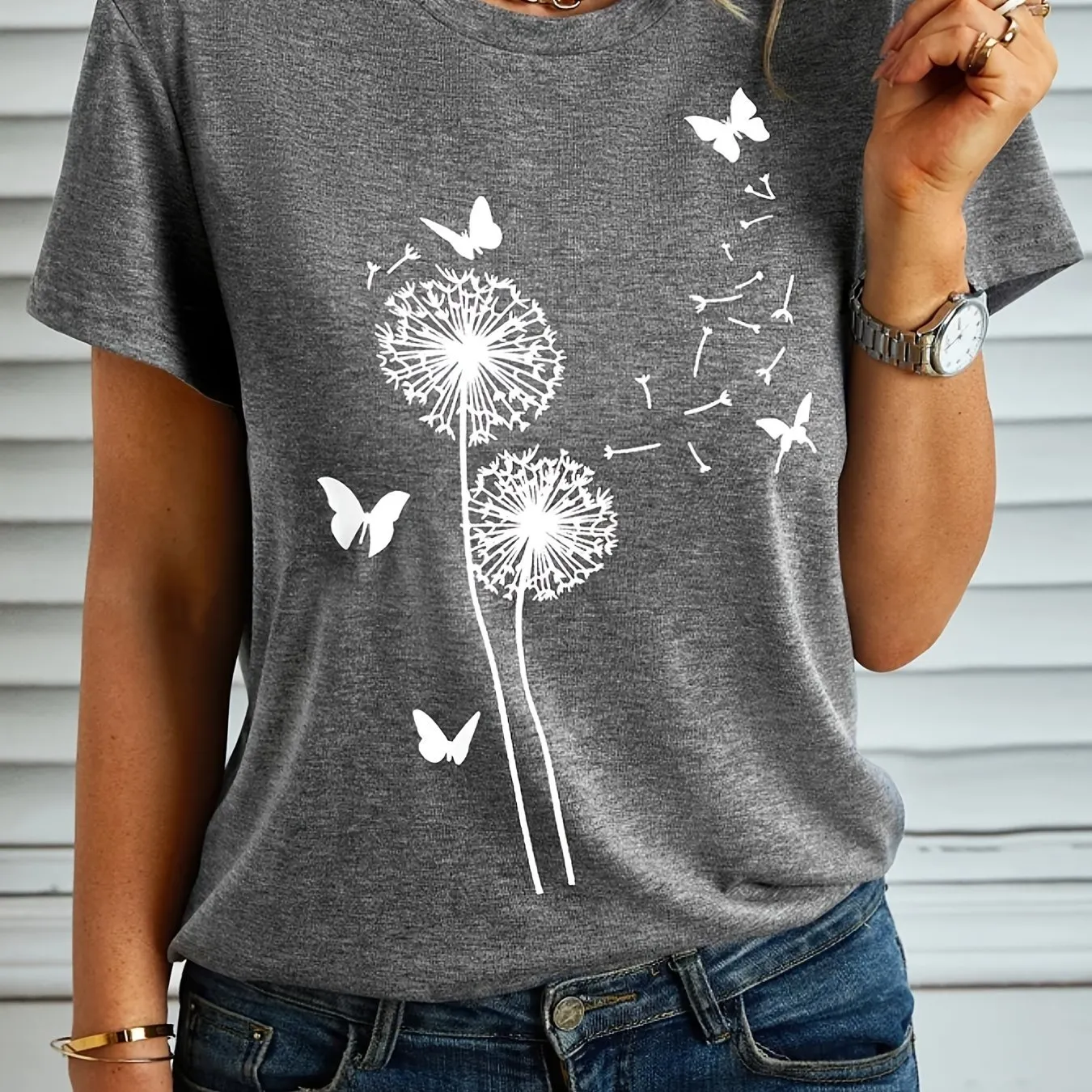Women's Dandelion and Butterfly Printed T-shirt – A Touch of Nature's Elegance