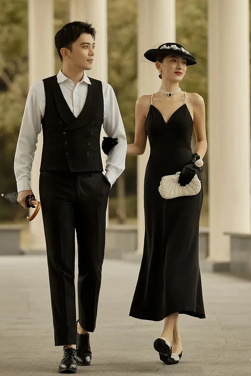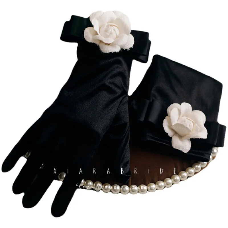 Women's Retro Hepburn Wind Black Evening Dress Butterfly Gloves