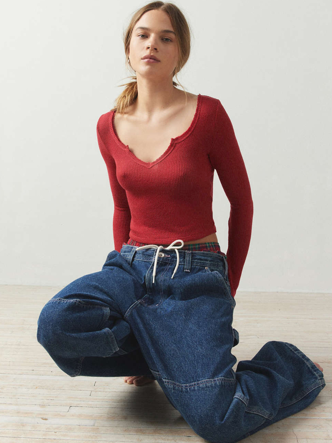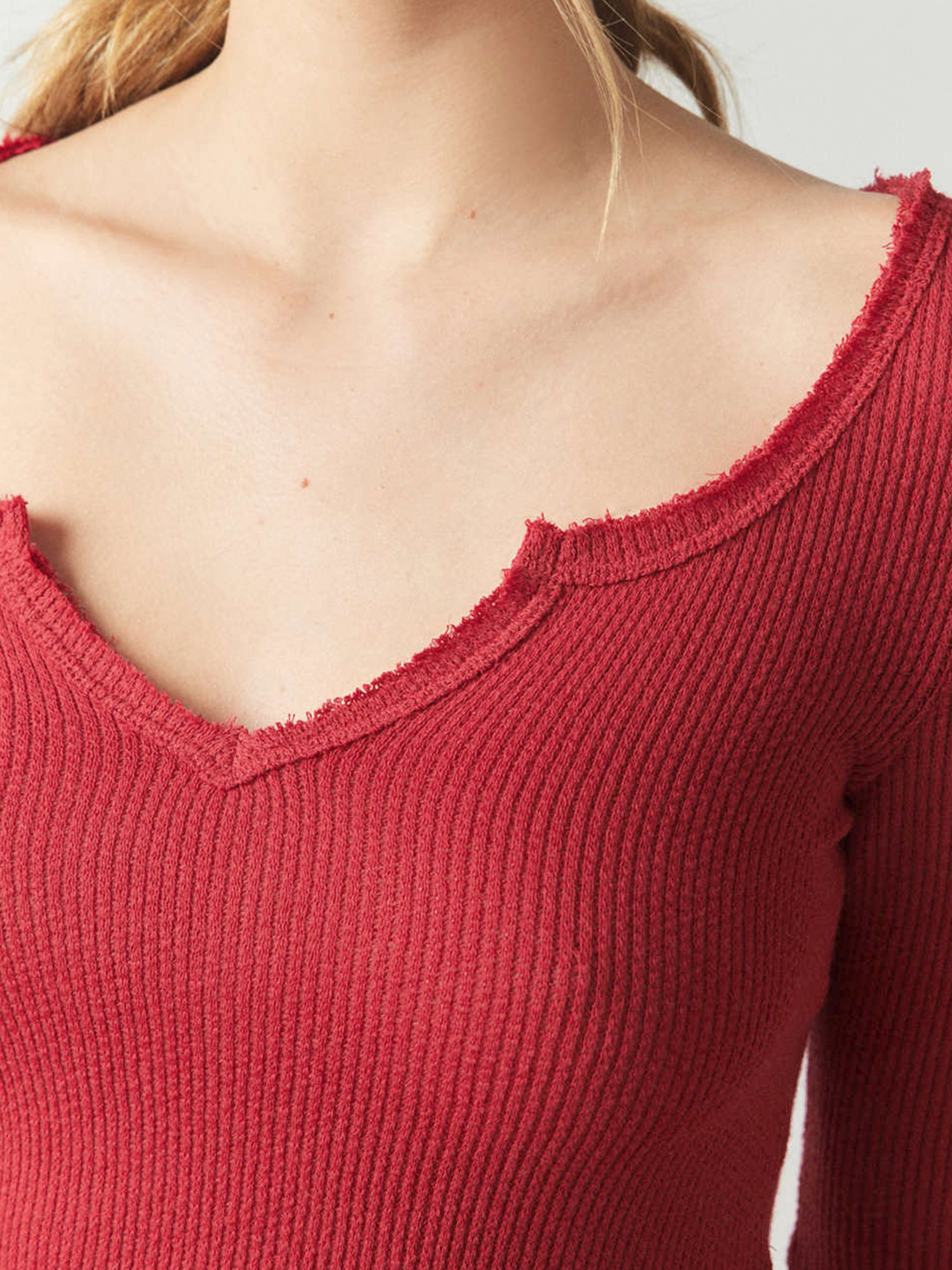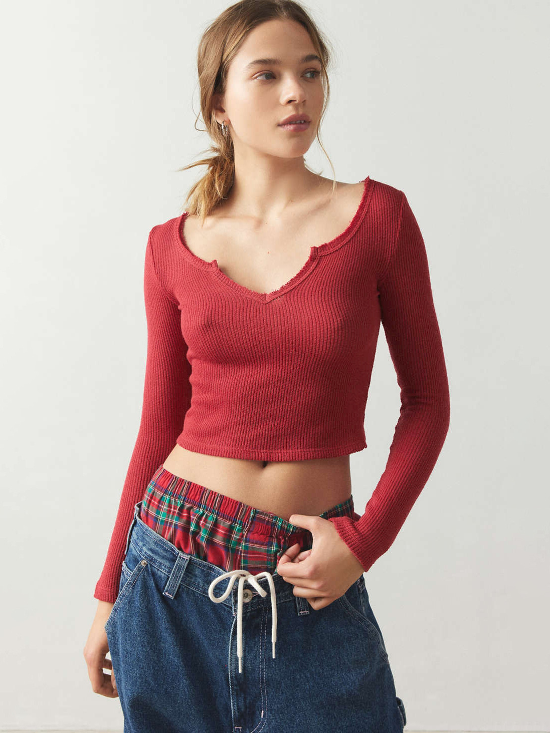 Women's Solid Color Ribbed Slim T-shirt V-neck