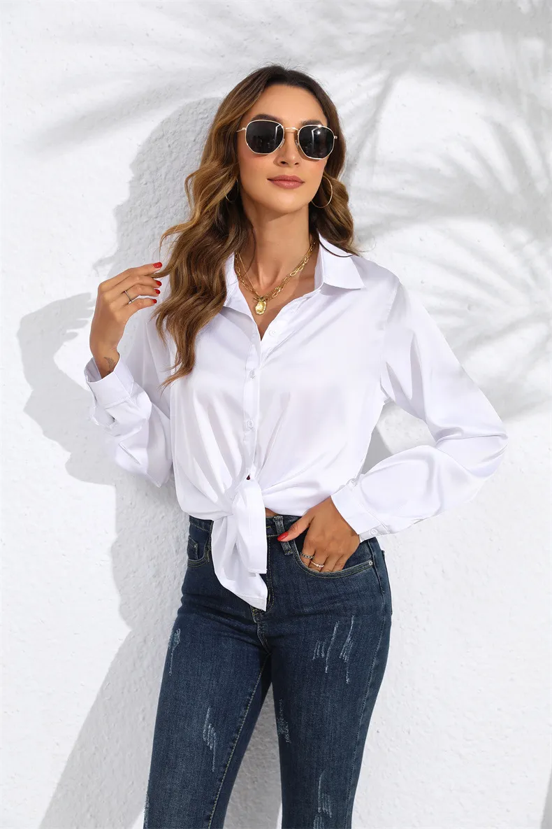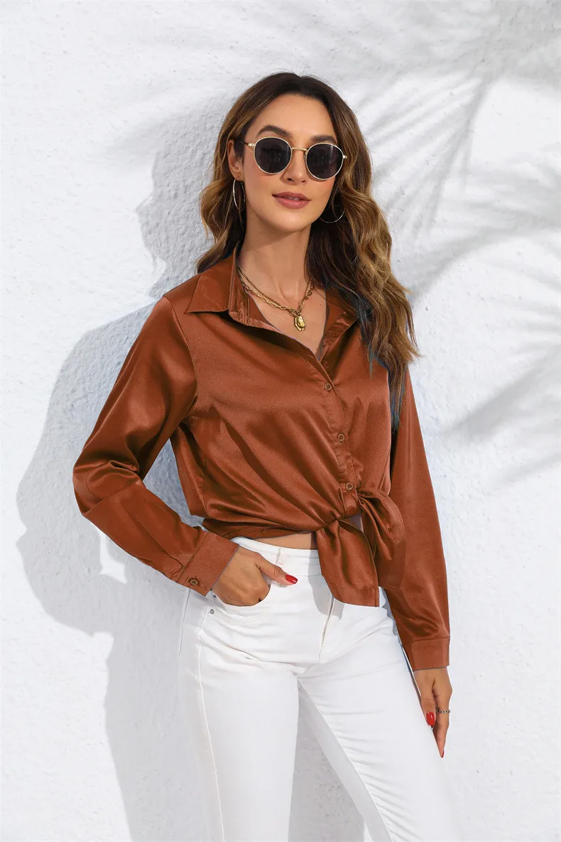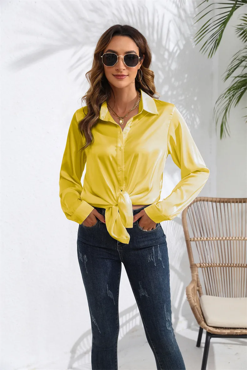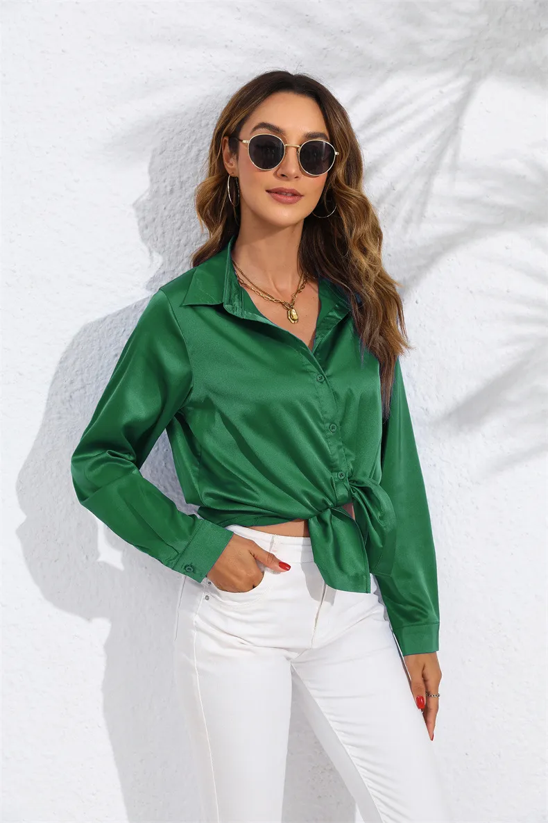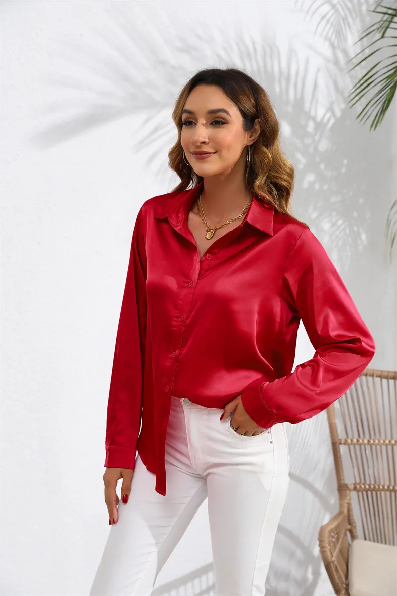 Versatility This satin blouse is incredibly versatile and can be styled in numerous ways. Wear it with tailored trousers and heels for a professional office look, or pair it with a skirt and statement jewelry for a night out. The solid color makes it easy to mix and match with different pieces in your wardrobe, while the satin finish adds a touch of elegance to any outfit. Whether you're dressing for work, a dinner date, or a special event, this blouse is a perfect choice.