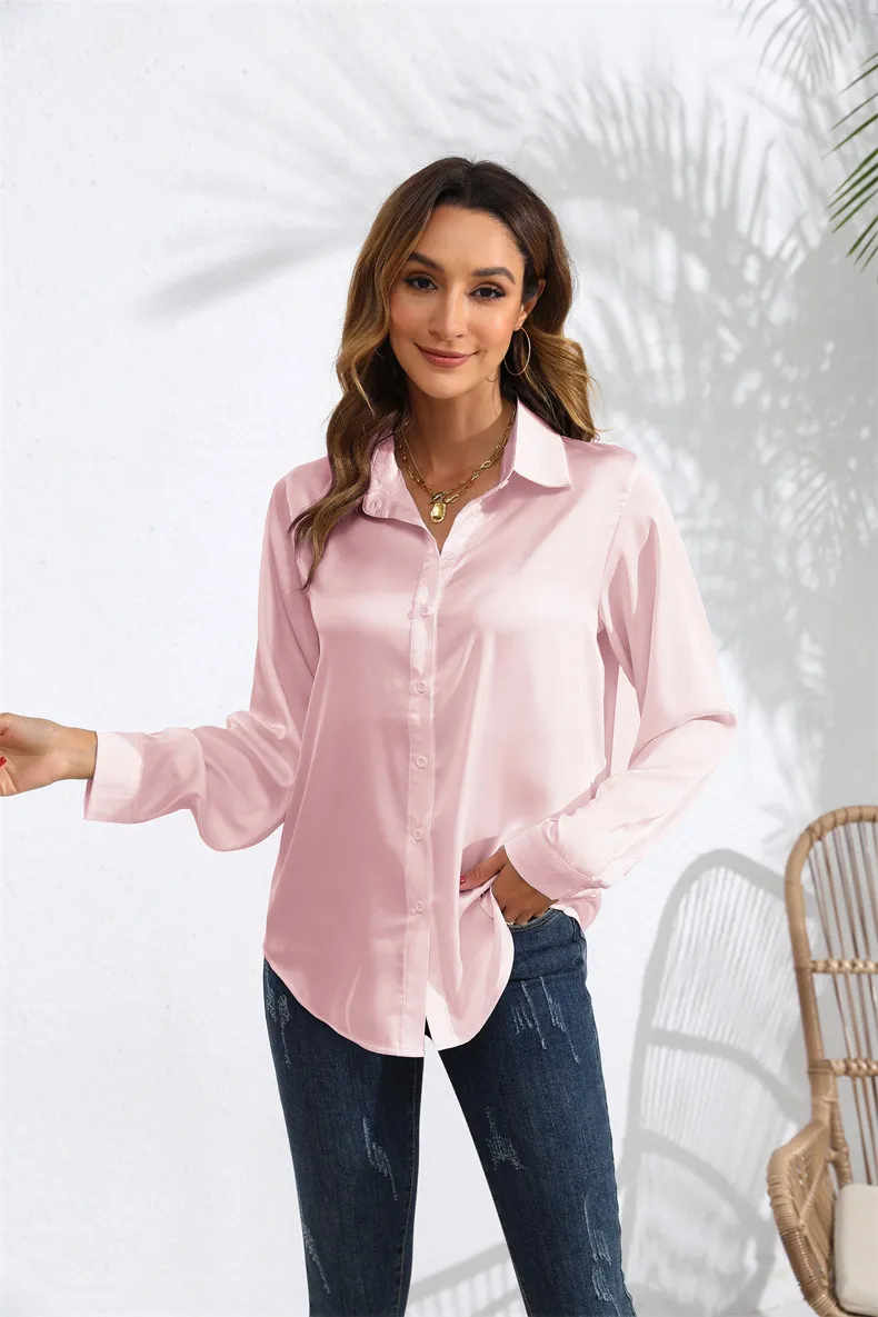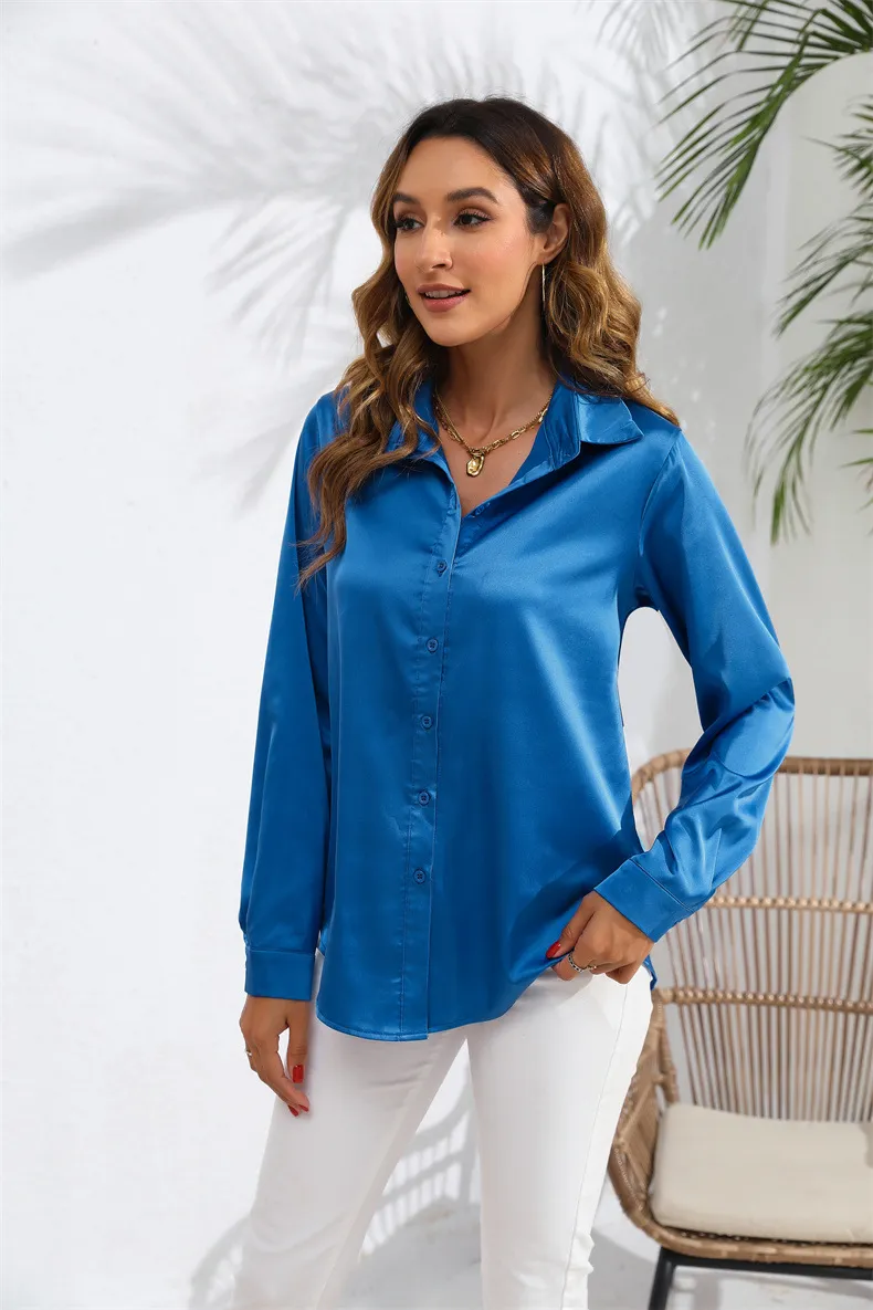 Comfort and Fit The Women's Solid Color Satin Long Sleeve Blouse is designed with both style and comfort in mind. The lightweight satin fabric feels soft against the skin, making it comfortable to wear for extended periods. The relaxed fit allows for easy movement, while the tailored design ensures a flattering silhouette. The long sleeves can be worn down for a classic look or rolled up for a more casual vibe, adding to the blouse's versatility.