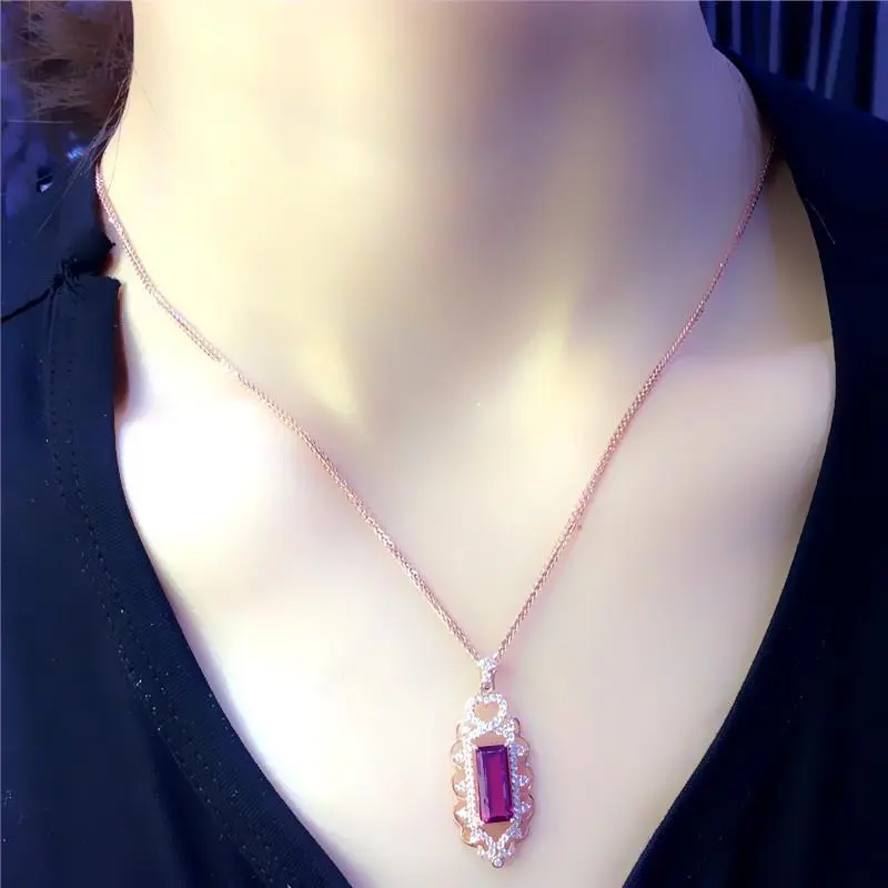 The pendant features a square-cut red stone, which can be made from ruby, garnet, or other red gemstones. Each stone is carefully selected for its vibrant color and high quality.
