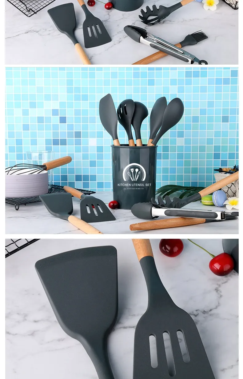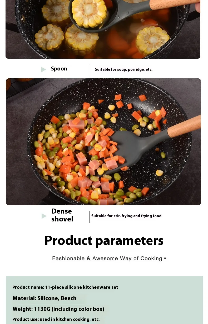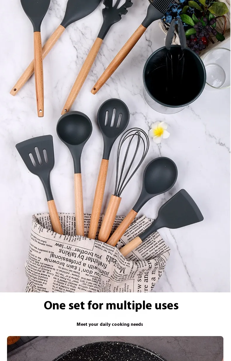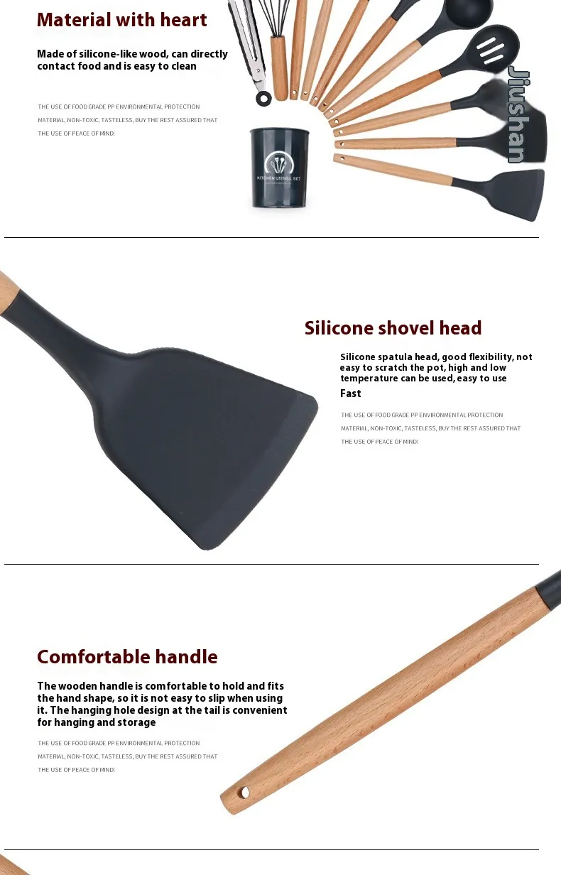 Wooden Handle Silicone Kitchenware 11-piece Non-stick Pan Cooking Spoon And Shovel Suit