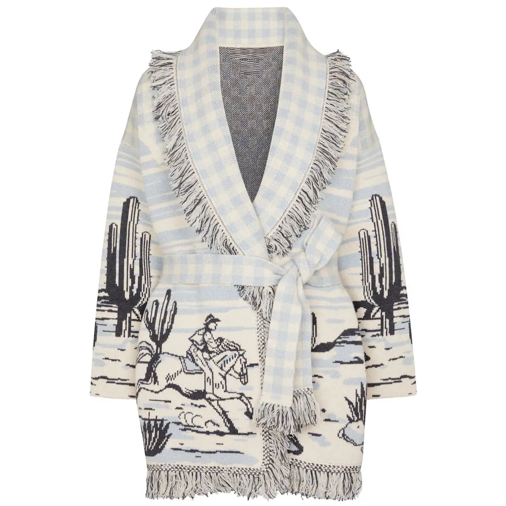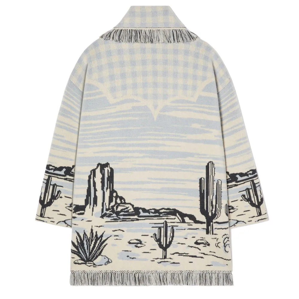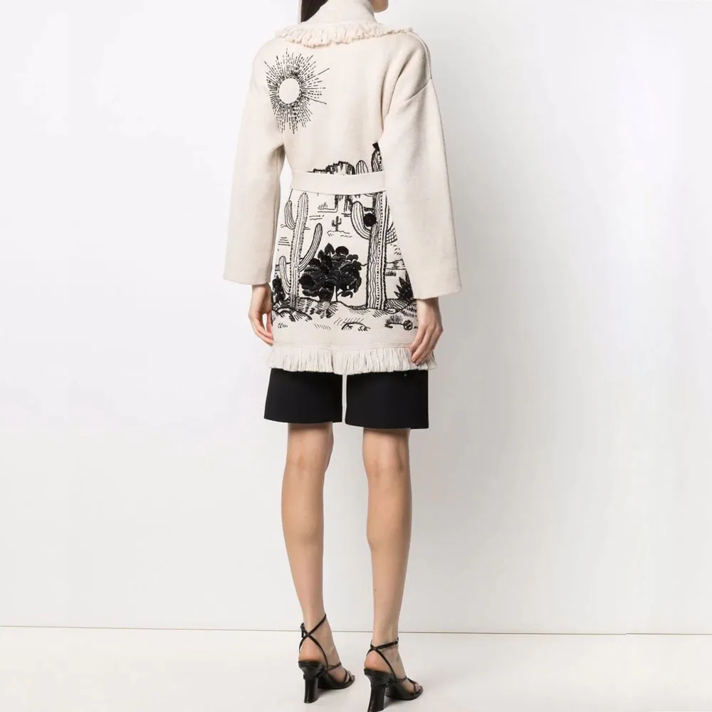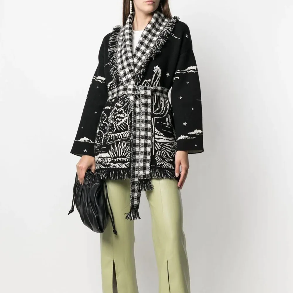 The tassel doodle jacquard pattern sets this cardigan apart from typical winter wear, offering a unique and stylish look.