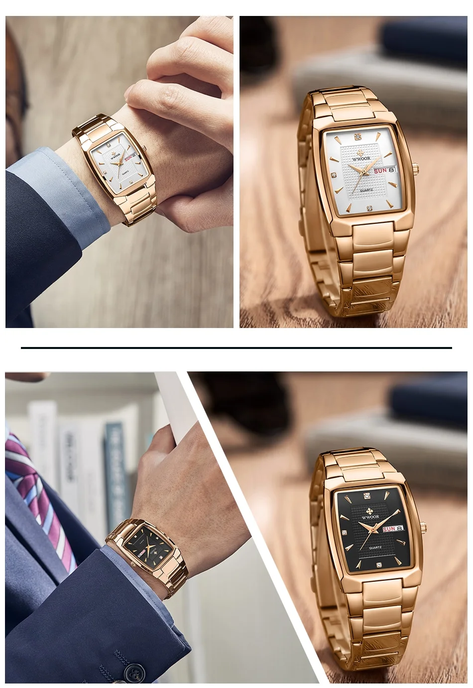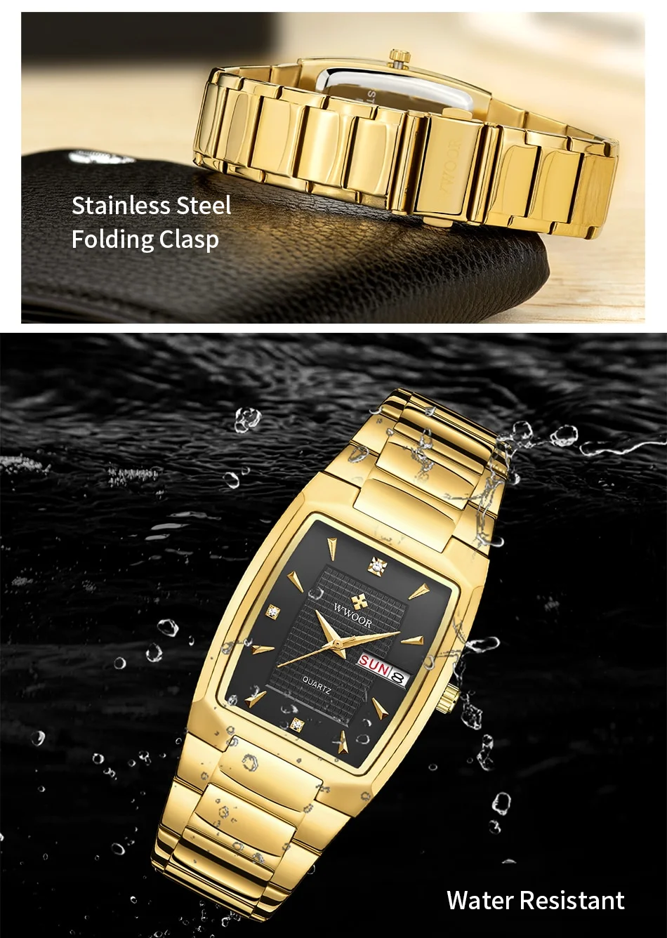 WWOOR 2024 Mens Square Watch Luxury Gold Stainless Steel Quartz Wristwatch