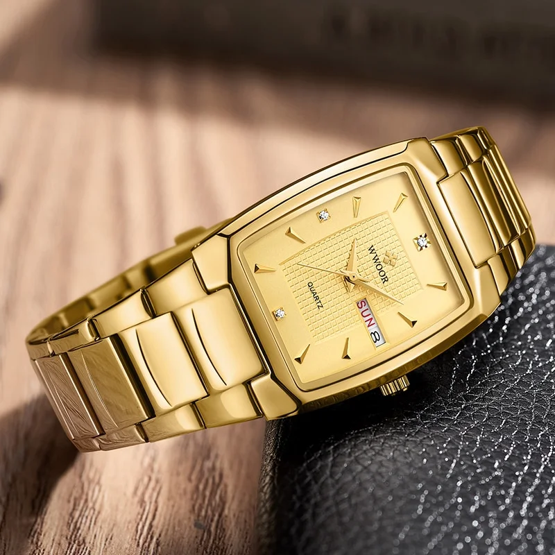 The WWOOR 2024 Men’s Square Watch is a sophisticated accessory that combines luxury, functionality, and style in a distinctive square design. Crafted from high-quality gold-tone stainless steel, this watch exudes elegance and durability, making it perfect for men who appreciate bold, statement pieces. Featuring an automatic week and date display, this quartz wristwatch is designed to keep you organized while enhancing your style, whether worn for formal events or casual outings. The precise quartz movement ensures reliable timekeeping, while the square face design adds a modern edge to this timeless accessory.