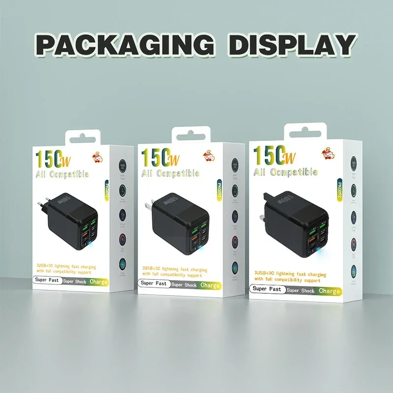 The Xiaomi 150W 6-port fast charger wall adapter supports PD and QC 3.0 for super fast charging. Compatible with iPhone, Samsung, iPad, Xiaomi, Huawei, OnePlus, and more, it ensures efficient charging for multiple devices simultaneously.