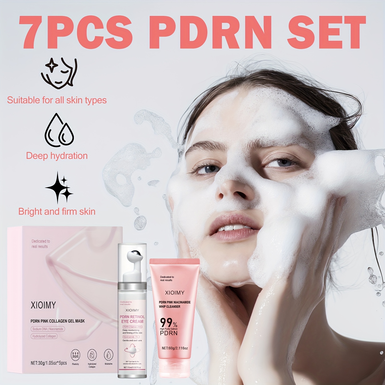 The XIOIMY PDRN Pink Collagen Skincare Set is a comprehensive skincare system formulated to address multiple signs of skin aging and fatigue using advanced, skin-supporting ingredients. The set includes a PDRN Pink Niacinamide Whip Cleanser, PDRN Retinol Eye Cream, and PDRN Pink Collagen Gel Masks, each designed to work synergistically to cleanse, treat, hydrate, and strengthen the skin.