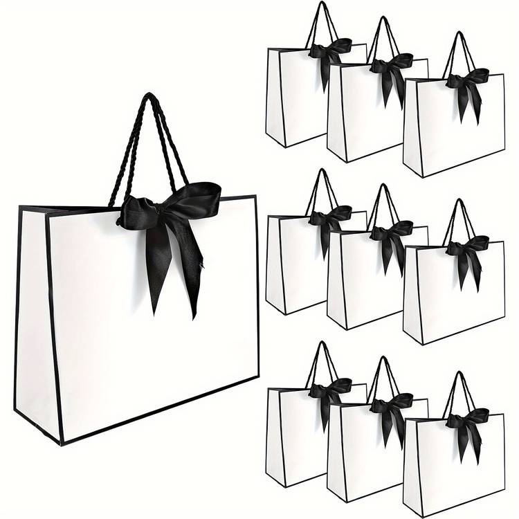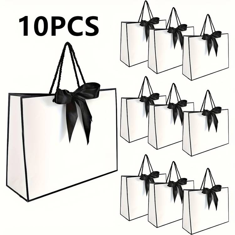 YIMUWN 10-Pack Elegant White Gift Bags with Satin-Like Black Ribbon Bows Premium Multi-Size Paper Favor Bags