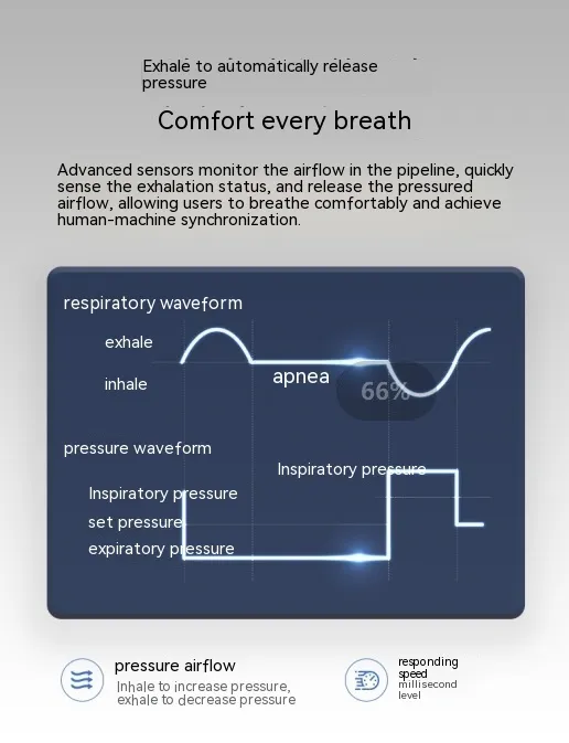 The ventilator employs exhalation therapy, promoting optimal airflow during sleep. This technology helps in reducing airway resistance, thereby minimizing snoring and enhancing overall sleep quality.​