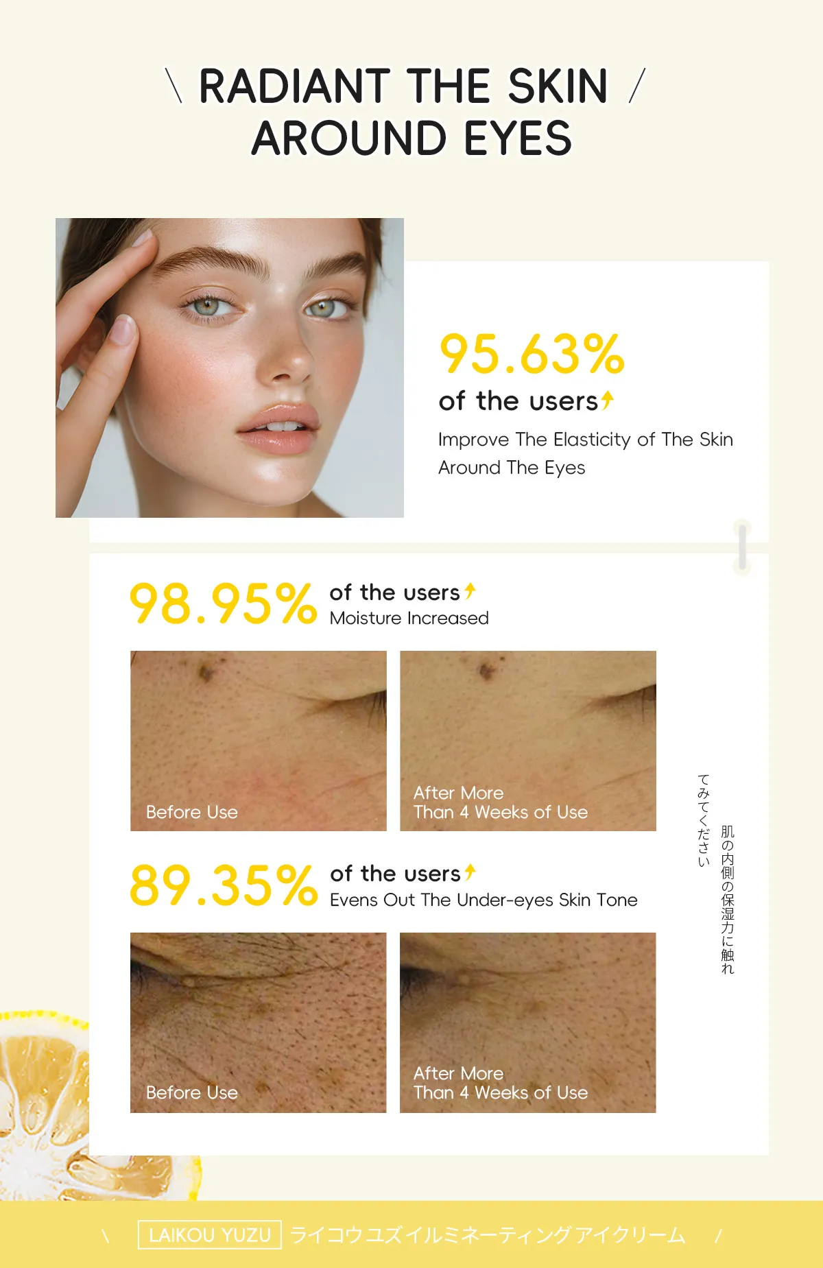 The YUZU Illuminating Eye Cream is infused with yuzu extract, which is packed with Vitamin C, a powerful antioxidant that brightens the skin. Regular use helps lighten dark circles, giving your eyes a refreshed and well-rested appearance.