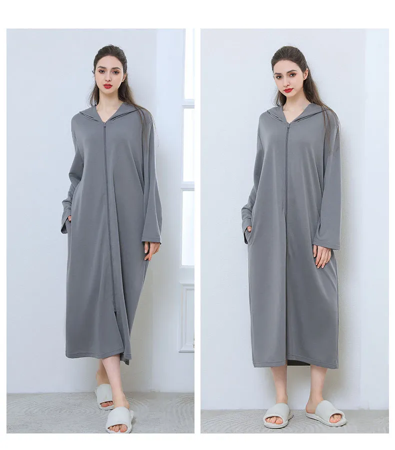Embrace cozy comfort and style with the Zipper Bathrobe Couple Hooded Nightgown Thin Pajamas. Perfect for couples who want to share warmth and comfort, this matching set features soft, breathable fabric that is ideal for lounging, relaxing at home, or unwinding before bed. The unique zipper design makes it easy to slip into, while the hooded feature adds extra warmth and comfort, making it perfect for cool evenings or mornings.