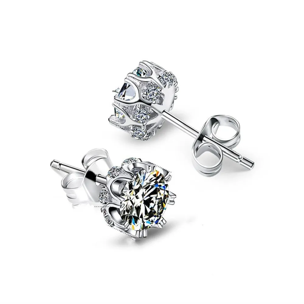 The earrings feature white zircon stones, known for their brilliant clarity and sparkle. Zircon is a gemstone that resembles diamond and is often used in fine jewelry for its stunning appearance.