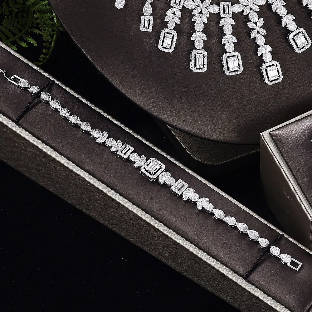 Each piece in this set – from the intricate necklace to the dazzling earrings, sophisticated bracelet, and elegant ring – is carefully designed to offer a harmonious balance of style, grace, and sophistication. Whether you're dressing for a formal event, a casual outing, or looking for the perfect gift for a loved one, the Zircon Set of Four brings luxurious allure to any occasion.